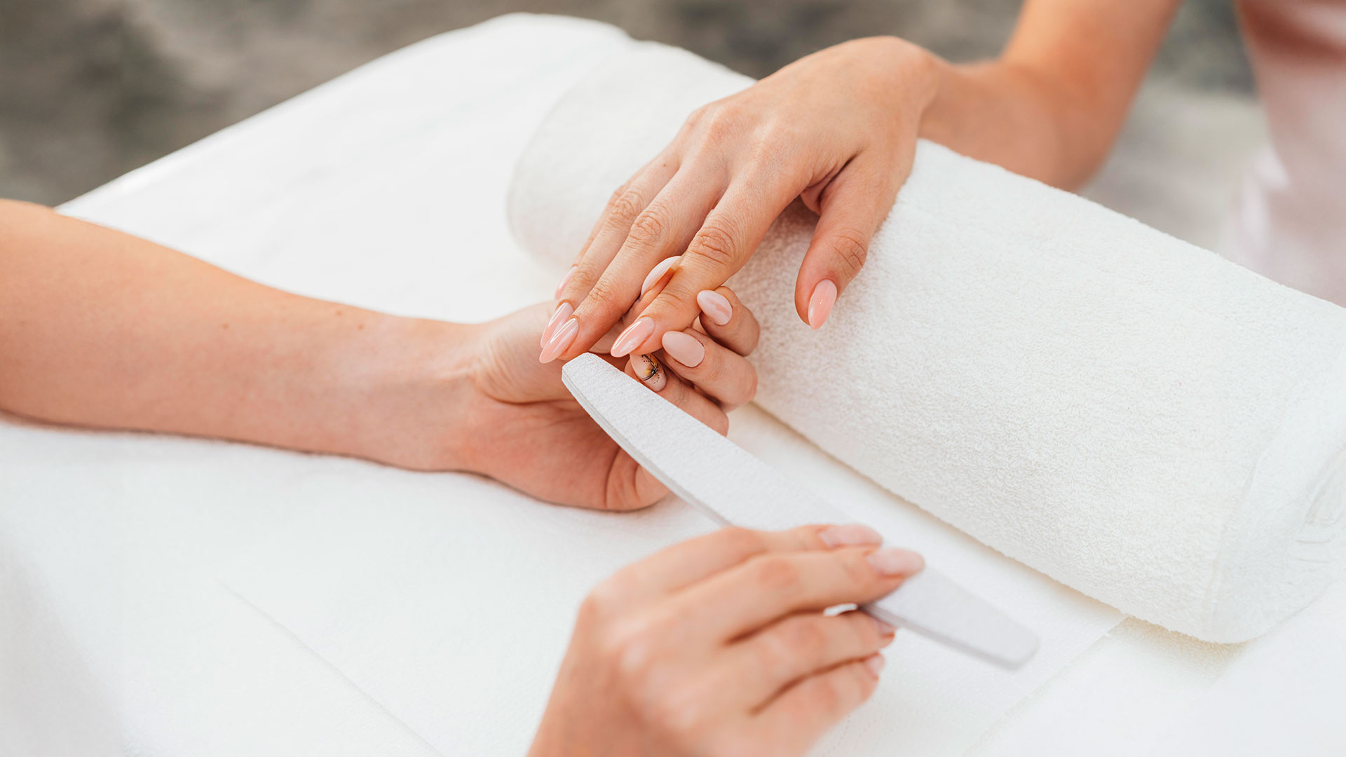 Warm soak to soften skin, cut and shape natural nails, cuticle trim, followed by oil or