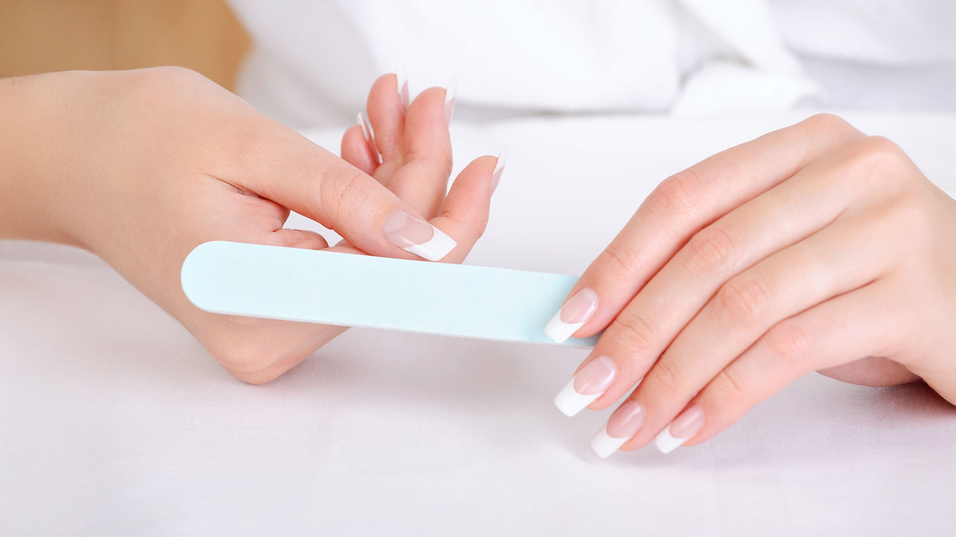 Warm soak to soften skin, cut and shape natural nails, cuticle trim, light durable color